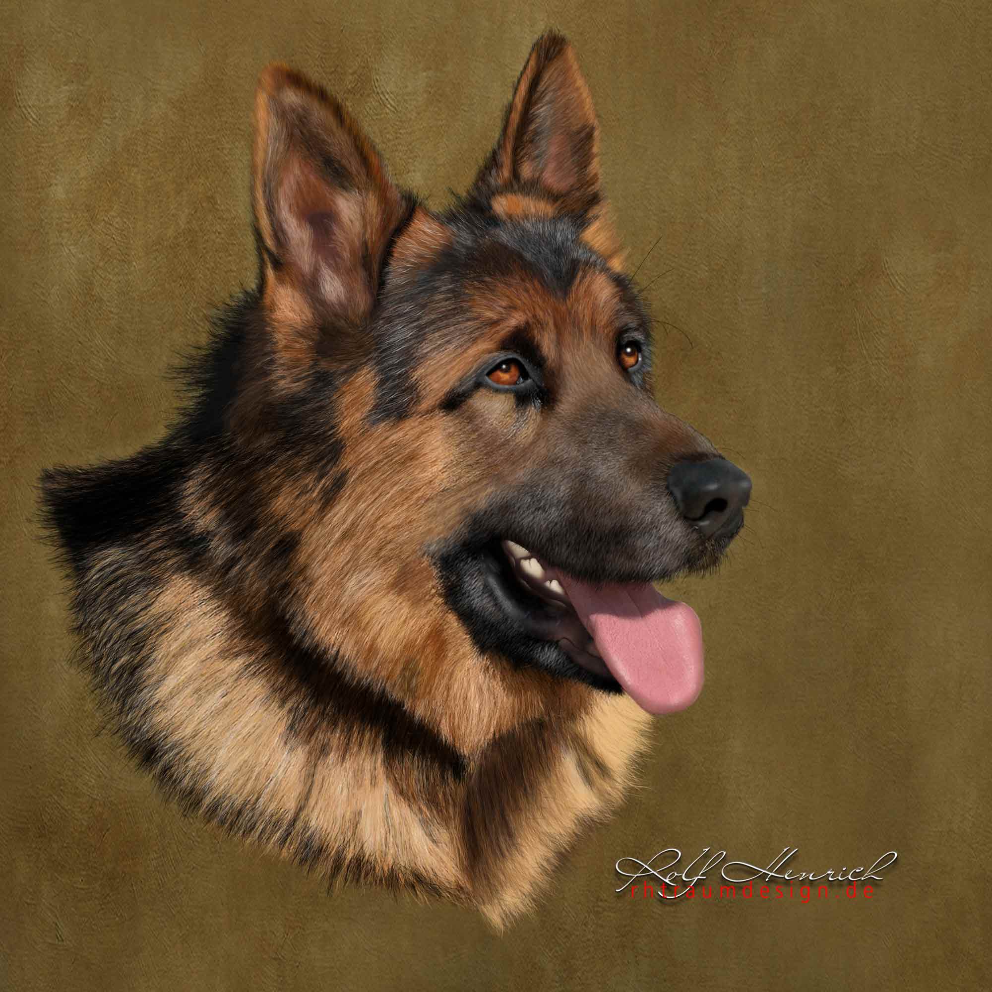 Schäferhund, Rasen und farbiger Hintergrund komplett handgemalt. Das Landhaus ist eingefügt.