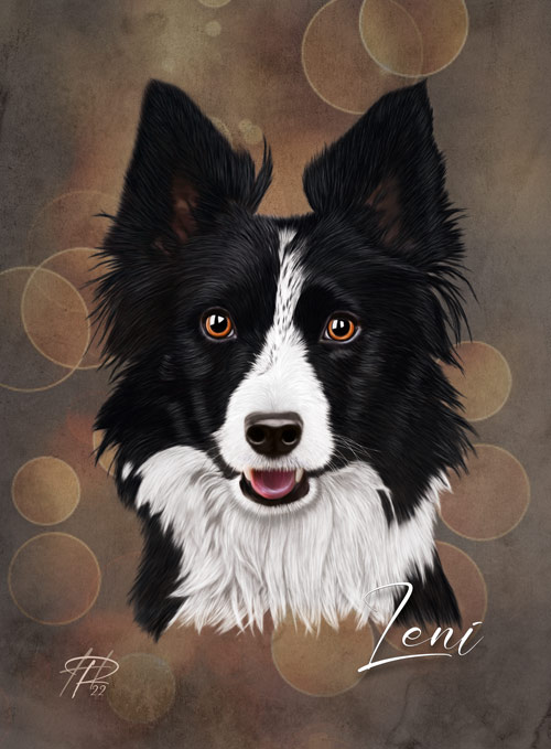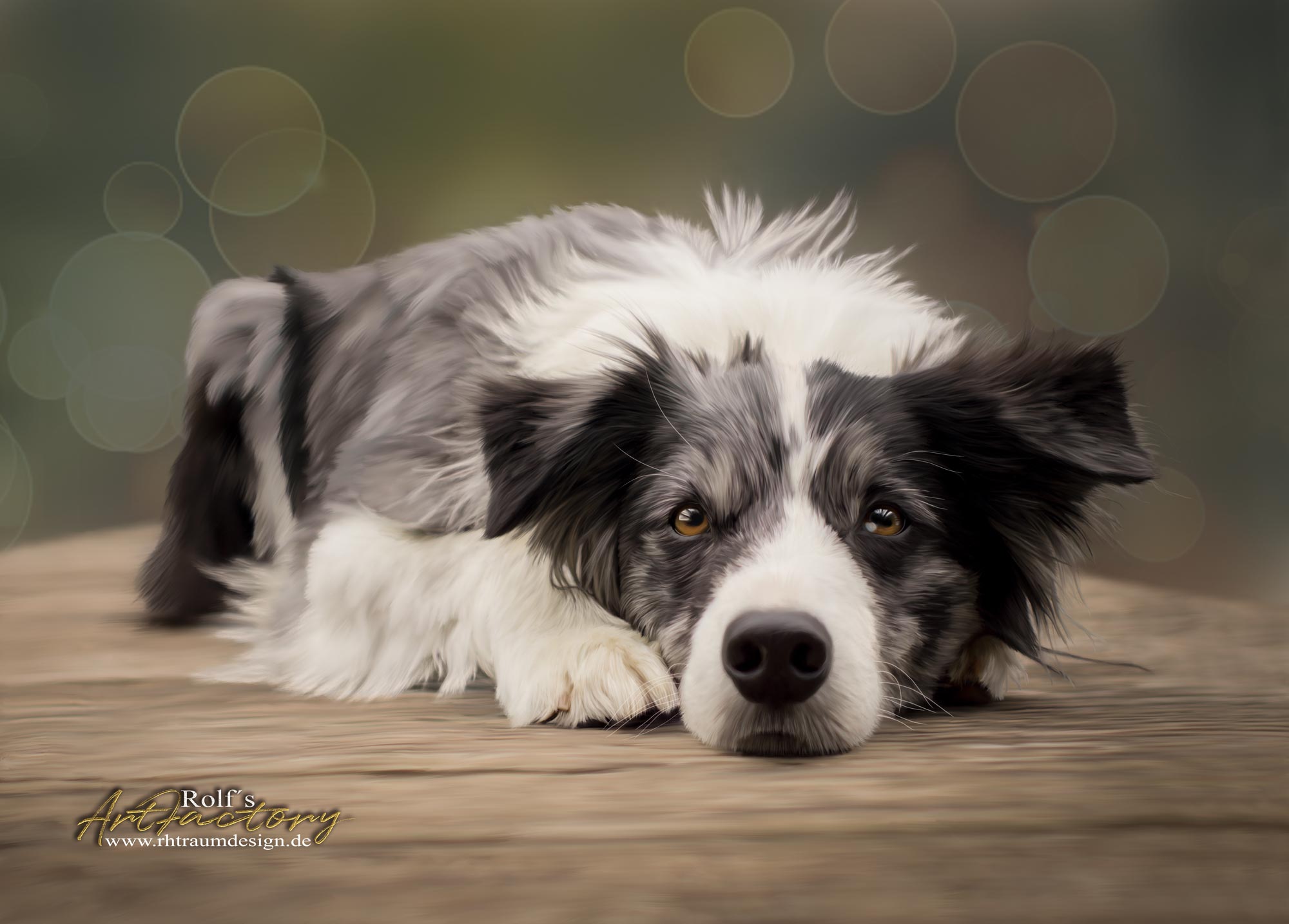 Border Collie "Silver" komplett handgemalt. Die Flairs im Hintergrund sind eingefügt.