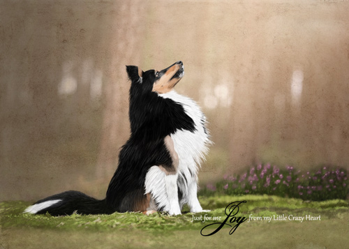 Sheltie "Flo" komplett handgemalt. Die Flairs im Hintergrund sind eingefügt.